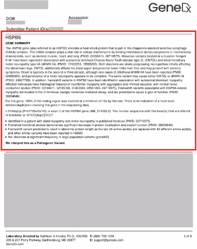 Not every test will find the exact cause, but in our experience, GeneDx and Ambry Genetics have successfully identified HSPB8 mutations causing MFM13.